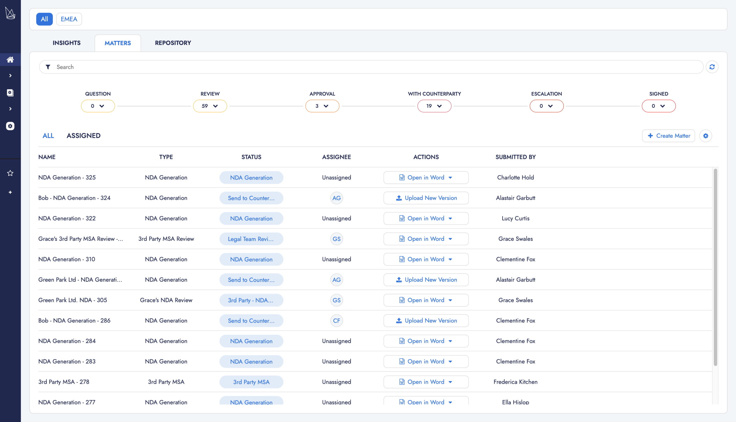 Integrate legal with the wider business through one centralised contract management system. Route requests automatically, remove bottlenecks and maintain visibility from draft to signature.