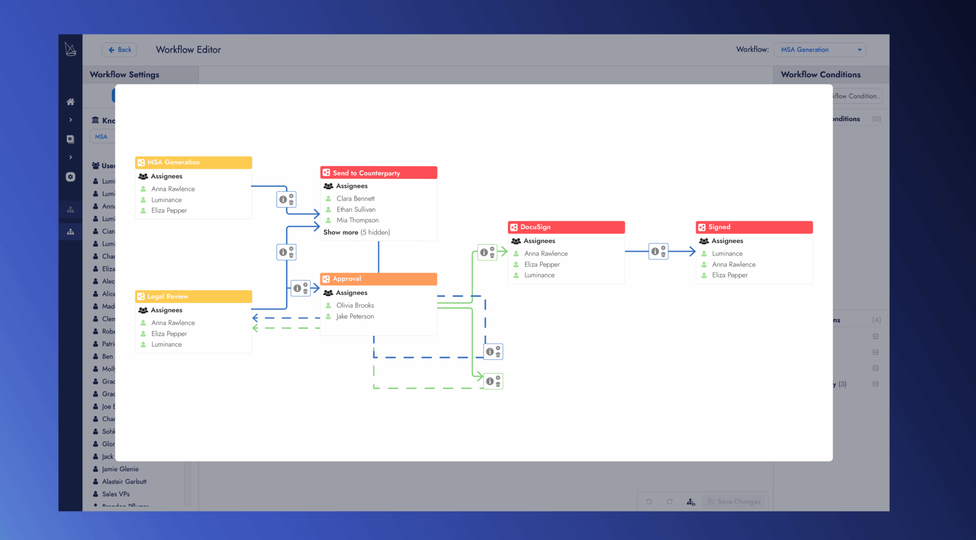 - Automated workflows to route contracts between Legal, Compliance, Business Users and Counterparties